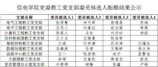 根据学院党委关于教工党支部换届选举的决定,经各党支部认真研究并召开党员大会,对推荐新的一届支部委员会委员候选人酝酿结果公示如下,请各召集人按照换届选举程序及学校党委《关于进一步加强和改进新形势下党支部建设的实施意见》中第11条实施教师党支部书记“双带头人”培育工程的要求开展换届工作。