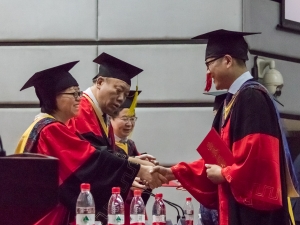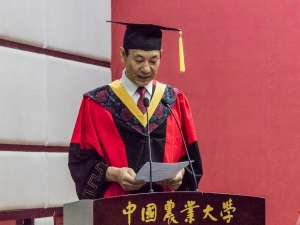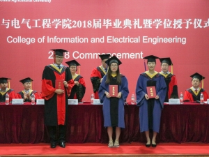 各代表发言结束后,本科毕业生学位授予仪式开始。高万林院长宣布授予学位的决定并讲话。他饱含深情地祝福并鼓励毕业生,希望毕业生的未来可以和祖国建设结合起来,为国家的社会主义现代化建设做出贡献。在学位授予仪式上,身着学士服的毕业生们一次走上主席台,庄严神圣地接受学位授予。学院领导和导师为他们拨穗正冠,并颁发学位证书,合影留念。学位授予仪式结束后,毕业生代表向主席台上的各位老师鲜花,以表示最真诚的感恩。高万林院长也将鲜花送给一位家长代表,感谢家长们一直以来的支持与信任。